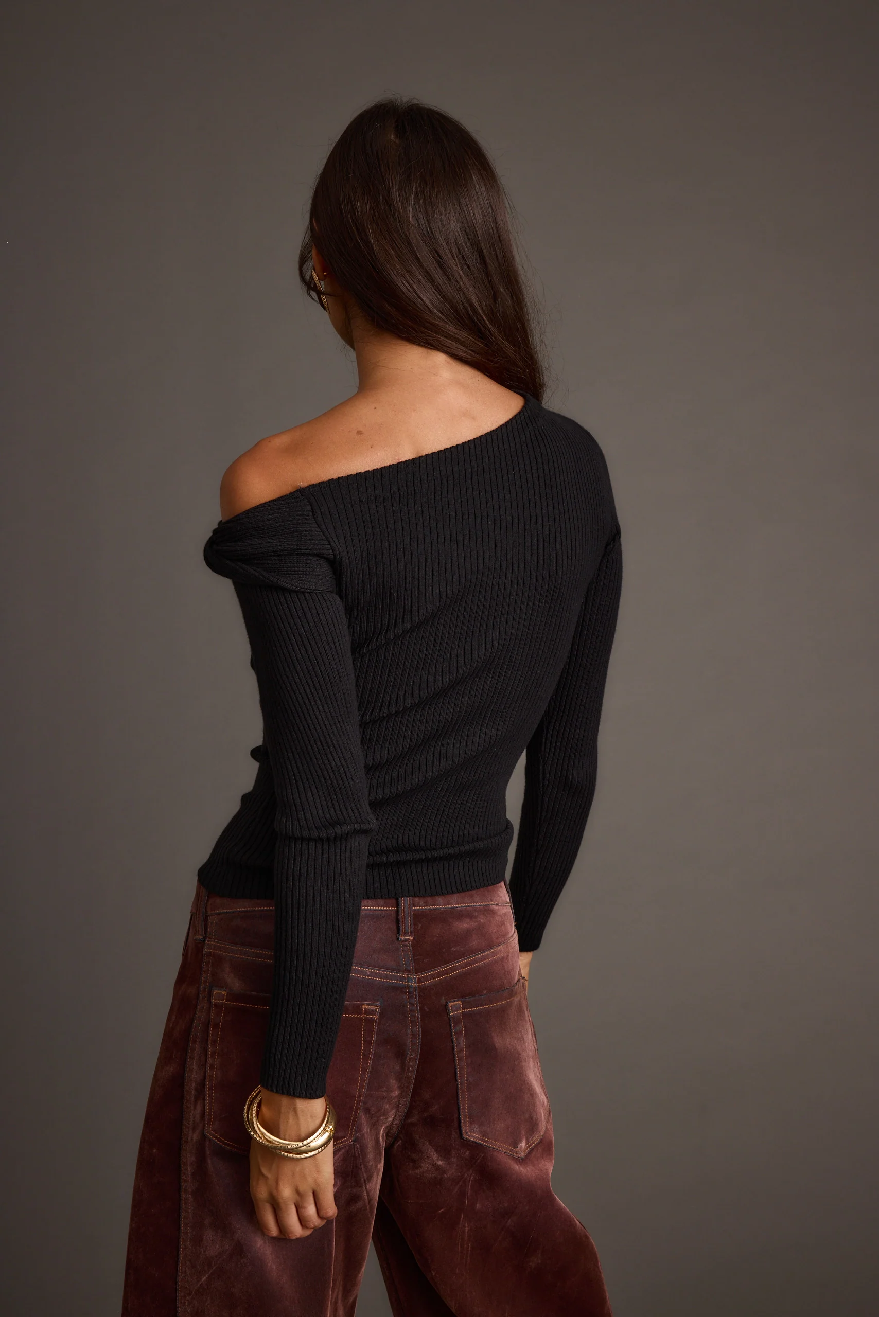 Our current obsession: the perfect off-the-shoulder moment. The Cindy Black Asymmetrical Sweater has a relaxed fit, soft ribbed texture, and that effortlessly cool drape that pairs best with great denim.
