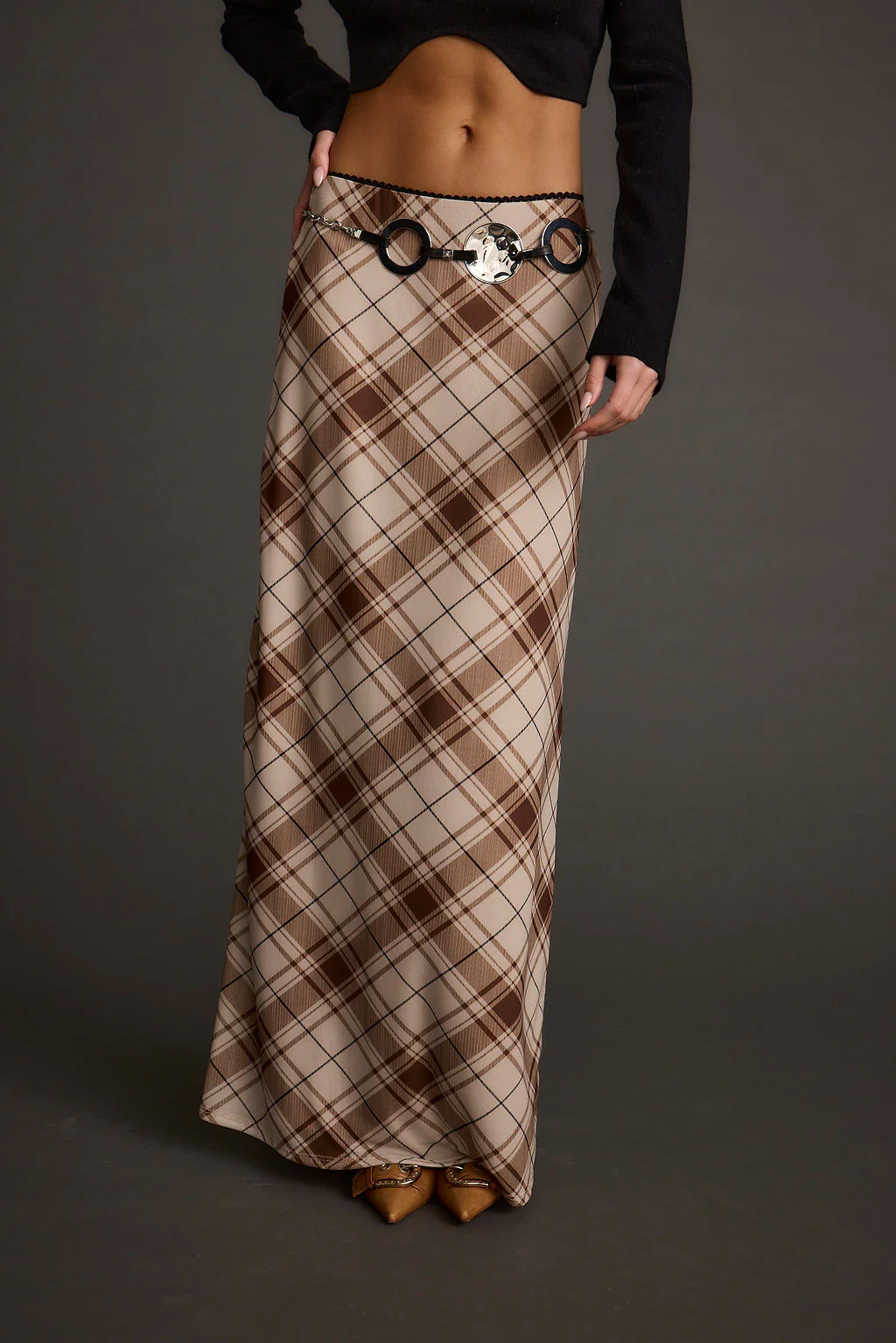 Très magnifique in every way, the Julia Brown Maxi Skirt is a must-have addition to add to your suitcase and wardrobe. Lightweight mesh fabric with a plaid pattern, you have the option to wear mid rise or low rise. Recommend to pair it with a classic t-shirt, loafers, and a pair of cool sunnies for a full look.