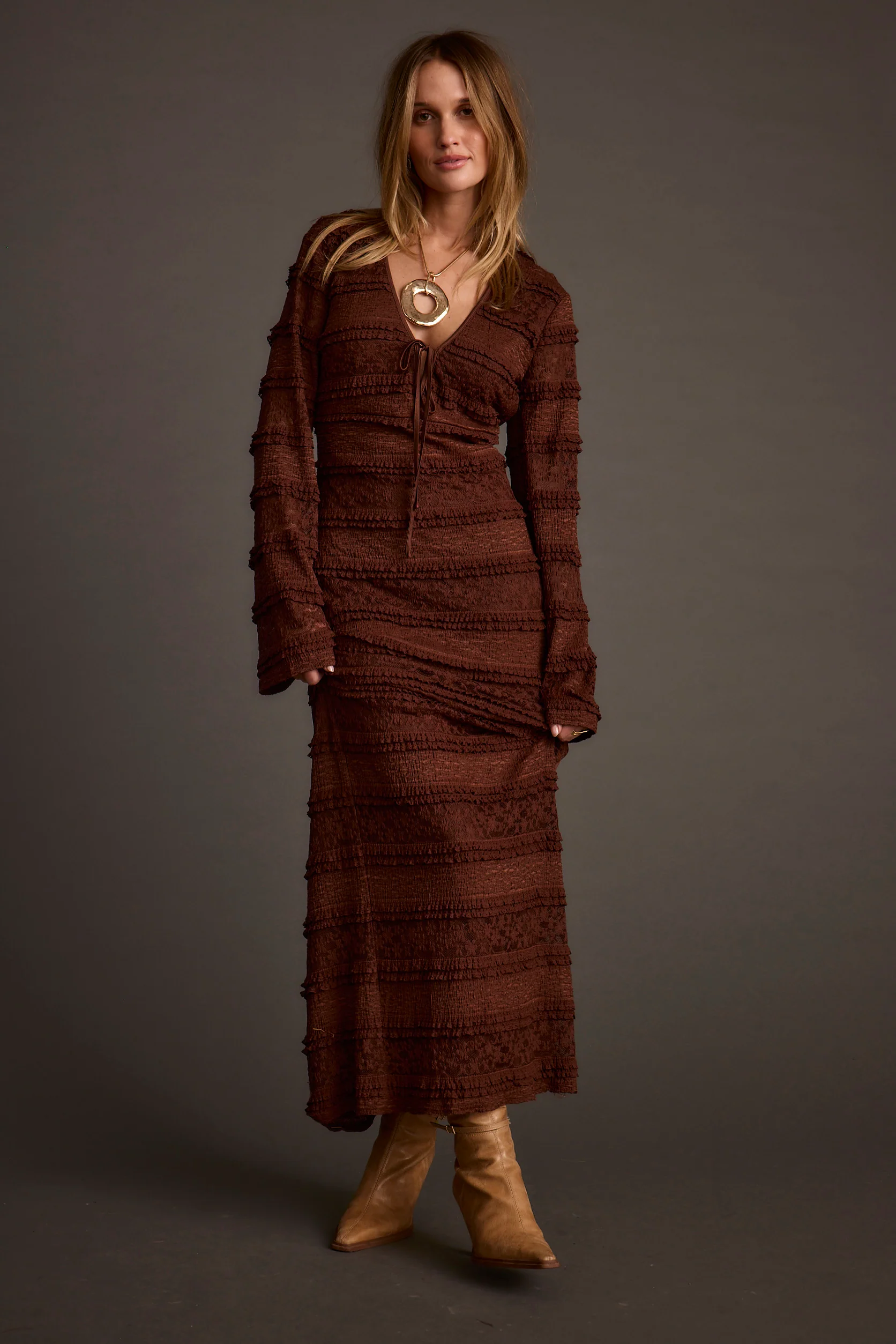 Meet the best selling Melrose Maxi Dress in the new color way, Espresso. You can't go wrong with espresso, tiered brown lace, and a flattering plunge neckline. The side slit and sheer lace bell sleeves add just the right amount of drama, so you’ll look incredible from every angle at any holiday occasion.